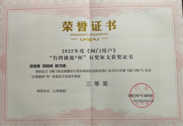 在2022年《閥門用戶》“臺灣捷流杯”征文活動中,由黃山良業智能控制股份有限公司終身名譽董事長項美根、總經理項曉明,湖南云箭集團有限公司陳可見三人撰寫,發表在《閥門用戶》雜志上的論文《閥門電動裝置在小型水電站的新應用》榮獲三等獎,并獲業內專家學者的高度評價,評獎中專家學者的評語有: