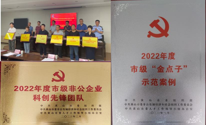 區委領導為獲評2022年度省、市級先進典型授牌。我公司榮獲“2022年度市級非公企業科創先鋒團隊”和“2022年度市級“金點子”示范案例”榮譽稱號。